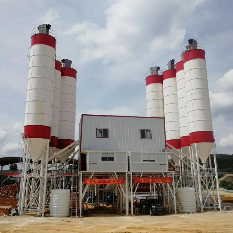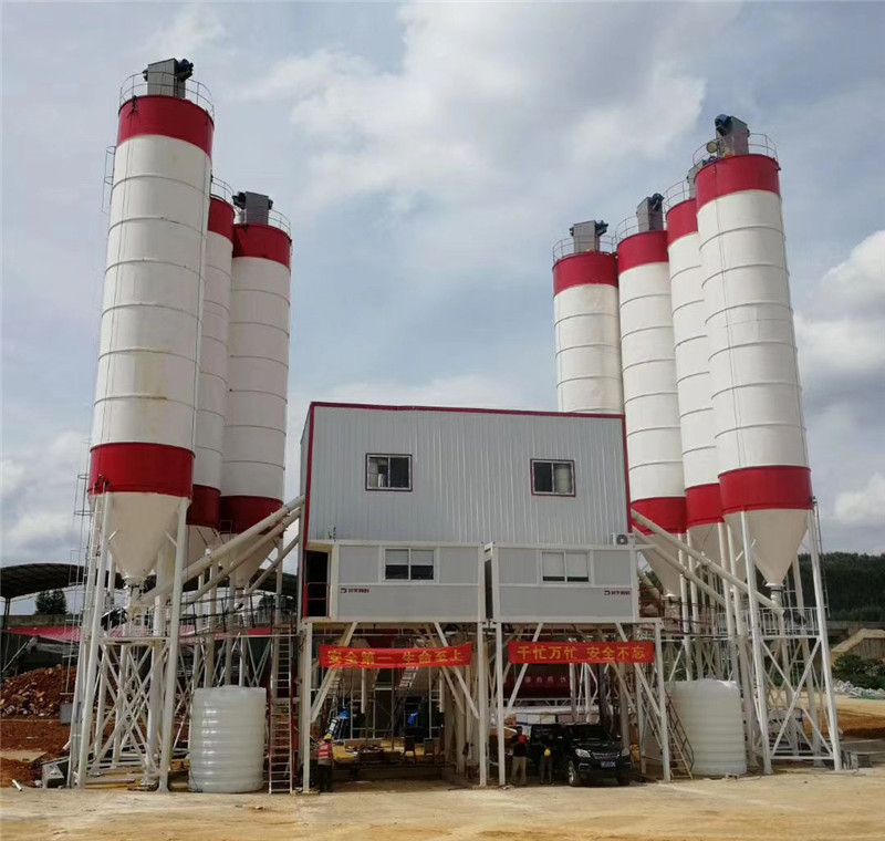1.HZS180混凝土攪拌站包含兩排水泥倉(cāng)及一系列螺旋輸送機(jī),由一個(gè)微機(jī)控制室控制整個(gè)混凝土攪拌站的作業(yè)??赏瑫r(shí)向兩輛混凝土運(yùn)輸車(chē)輸送攪拌物料。