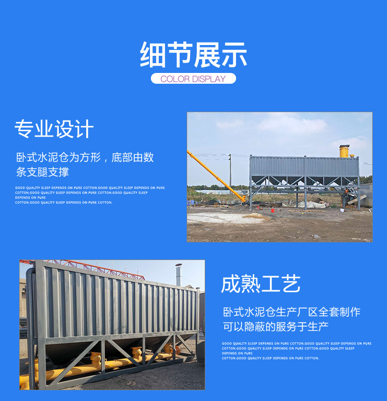臥式水泥倉被廣泛應(yīng)用于各種移動式混凝土攪拌站,免基礎(chǔ)混凝土攪拌站和其他臨時使用的混凝土攪拌站或穩(wěn)定土拌合站中。